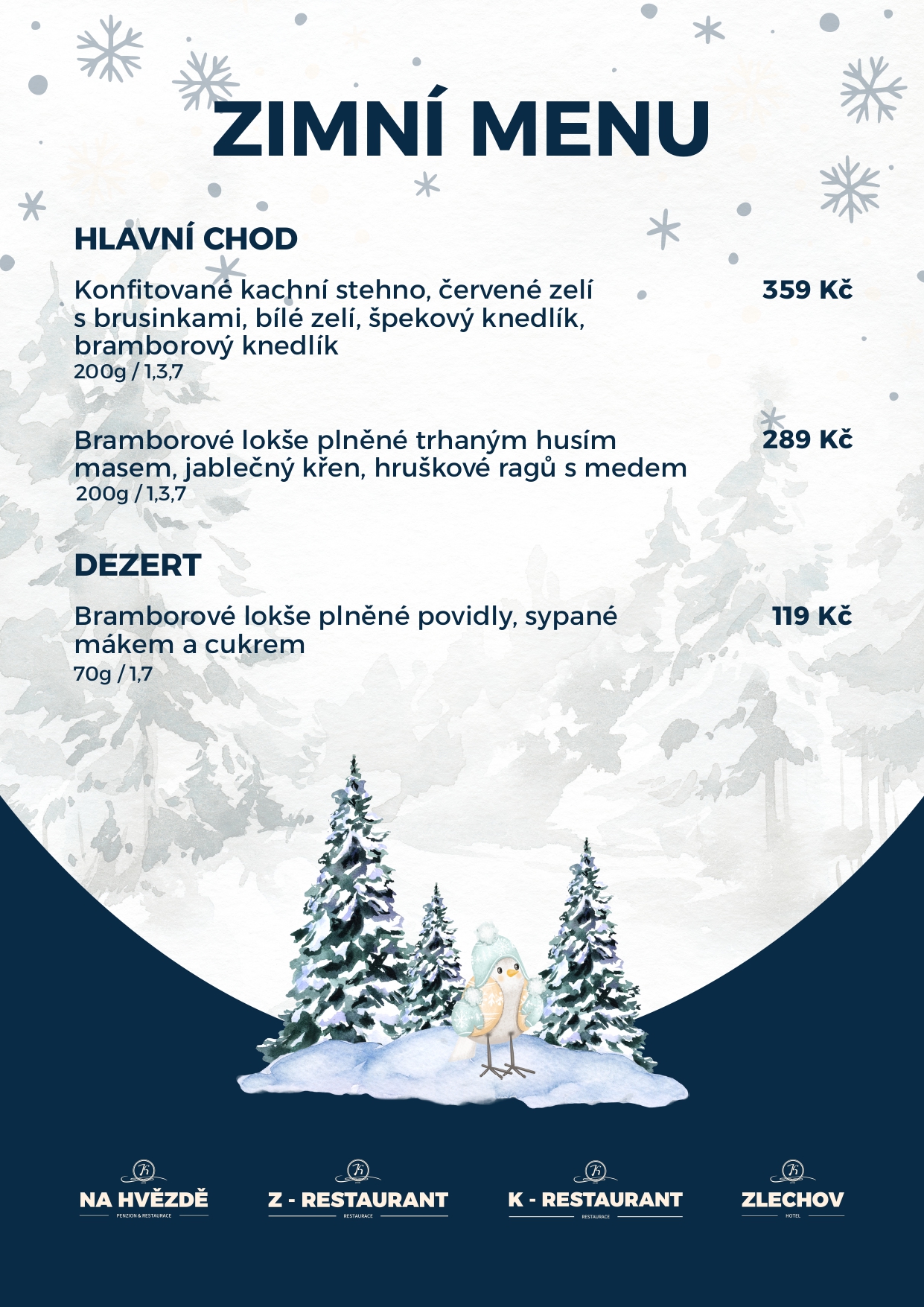 Ať už se k nám schováte před mrazem, nebo si jen chcete dopřát kousek zimní atmosféry na talíři, naše menu je připraveno zahřát Vás chutěmi, na které se nezapomíná. Přejeme Vám příjemné chvíle u stolu a dobrou chuť – ať Vám naše zimní speciality vykouzlí stejně krásnou náladu, jako nám radost z jejich přípravy.