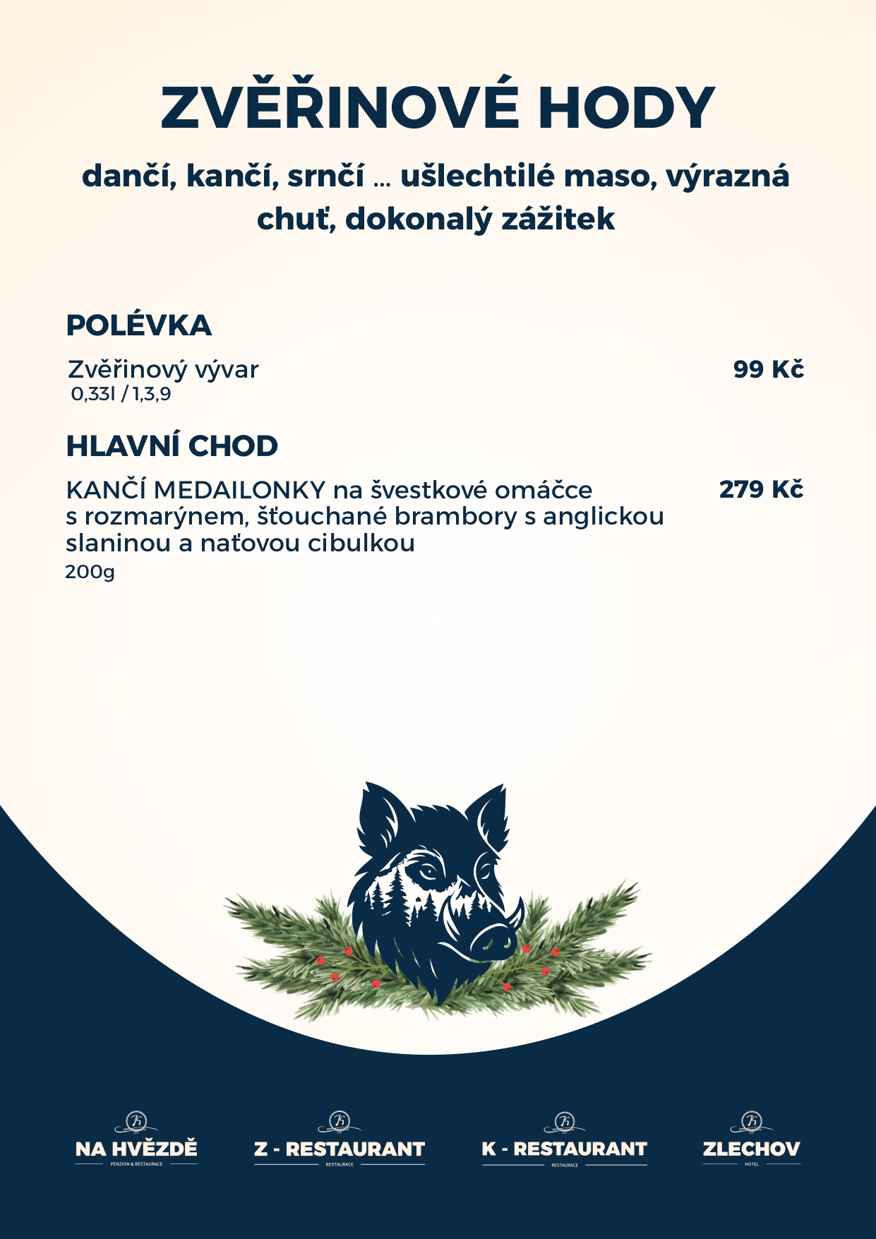 Dopřejte si návrat k poctivé kuchyni inspirované přírodou. Zvěřinové hody přinášejí ušlechtilé maso, výrazné omáčky a vůně, které probudí všechny smysly. Každý chod je připraven s respektem k tradici i důrazem na moderní gastronomický zážitek.