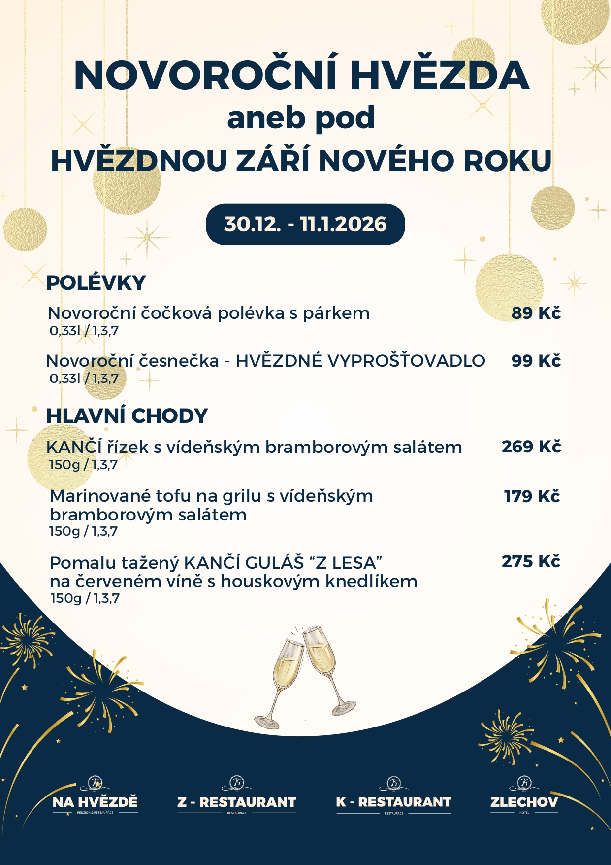 S příchodem nového roku se naše restaurace rozzáří hvězdnou atmosférou plnou chutí, vůní a pohody. Připravili jsme pro Vás speciální novoroční menu, které propojuje tradiční české suroviny s lehkostí sváteční kuchyně. Každý chod je malým požitkem – oslavou nových začátků i poctou poctivé kuchyni, kterou milujeme. Přijďte si s námi vychutnat chvíle pod hvězdou září nového roku.