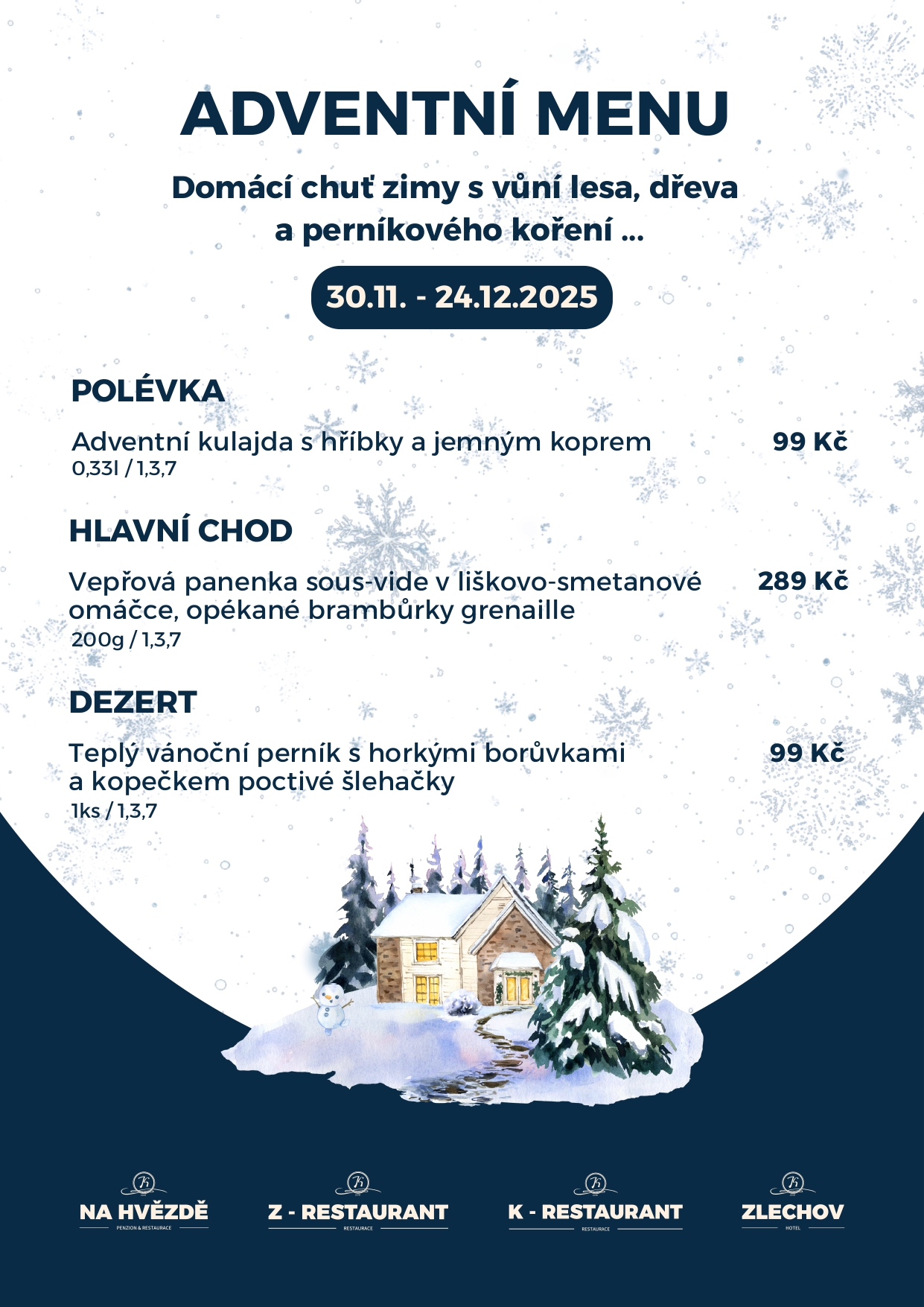 Naše Adventní menu Vás přenese do světa klidu, tradic a poctivých chutí. Ať už přijdete sami, s rodinou nebo přáteli – společné chvíle chutnají nejlépe právě v tomto čase.